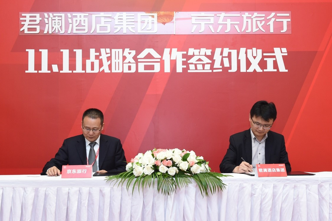 (京东生活旅行业务总经理孙峰与君澜酒店集团营销中心总经理杨晓允出席签约)