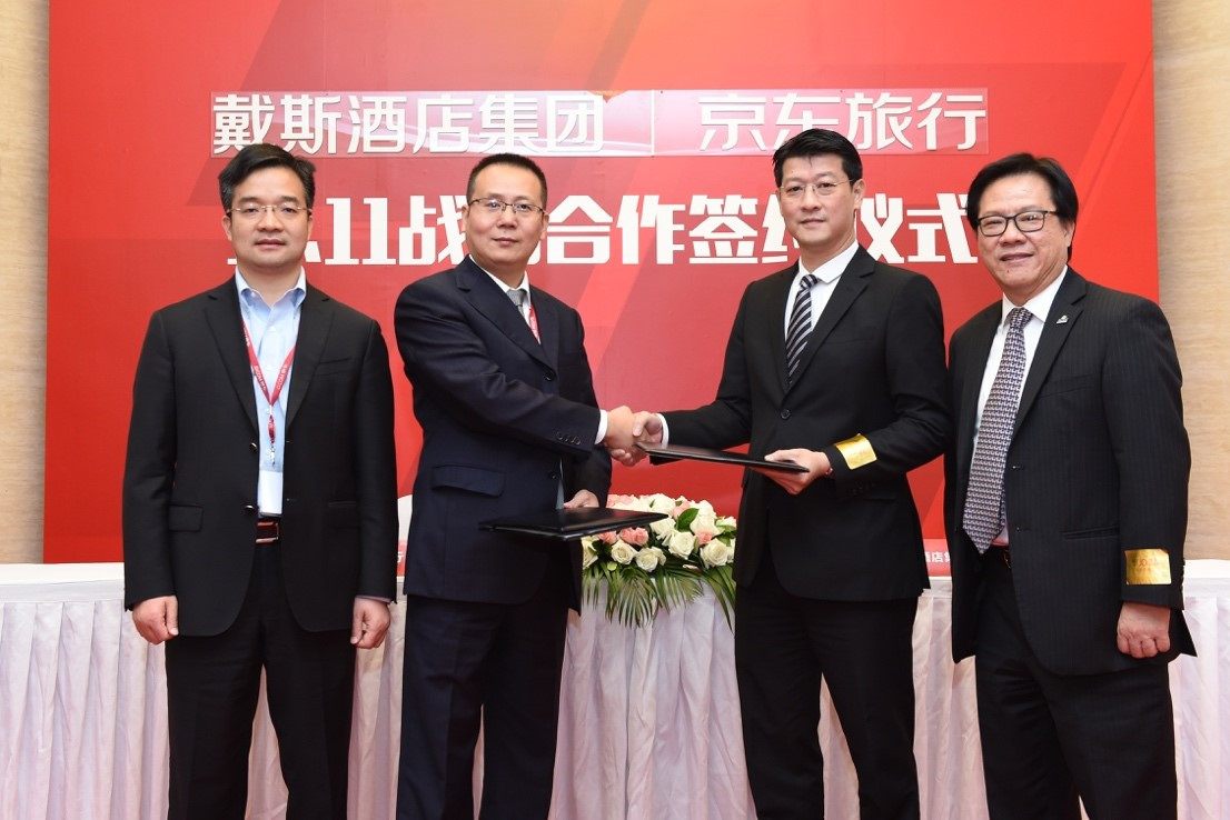 (京东集团副总裁、3C文旅事业部总裁胡胜利、京东生活旅行业务总经理孙峰与美国戴斯酒店集团CEO陈嘉财、美国戴斯酒店集团市场销售总监蒋志忠出席签约)