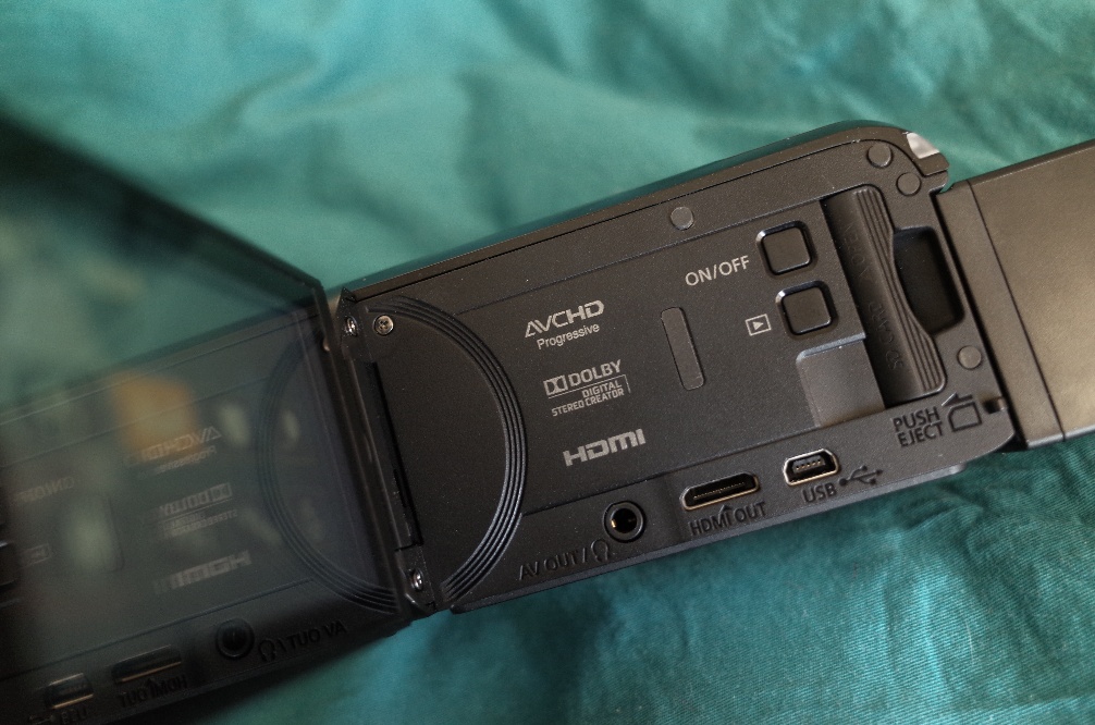 家用DV最大的优势就是便捷,为了方便操作,佳能HF R86并没有配备多种功能按键,打开机身可以看到机身内侧仅有电源键和播放键,大部分功能选择都可以通过3.0英寸显示屏的触屏功能实现。机身后部,就是SD存储卡的插槽,需要轻轻拨动才能打开,并且关闭仓盖才可以录制,这也保护了储存卡的读写安全。