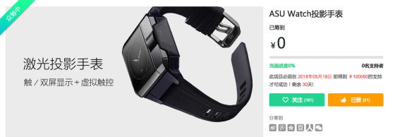 手背上投影出虚拟画面,变成另外一个屏幕,点击手背就能完成操作指令,这是不是科幻片中常有的桥段?借助于激光显示和虚拟触控,这项黑科技正在走进人们的日常生活。4月18日,由一数科技研发的激光投影手表ASU Watch正式登陆京东众筹,设置从159元到29499元的4个不同价格档位供选择,计划1个月时间内众筹10万元。这款智能手表最大的亮点就是具备双屏显示和虚拟触控功能,能够在手背上投影出虚拟屏幕。
