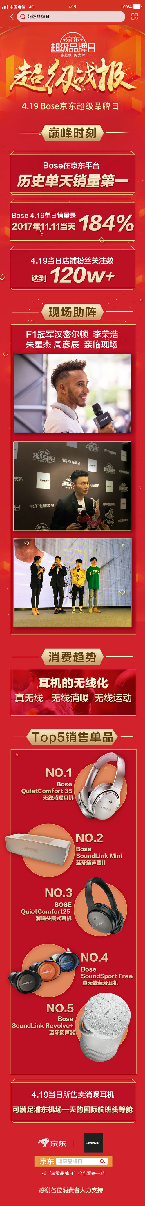 京东数据显示,截止20日12时,BOSE京东超级品牌日创佳绩,明星助阵下销量节节攀升,创下BOSE在京东平台历史单天销量第一,日销量更超2017年双十一的184%,BOSE店铺粉丝数量突破120万。此次BOSE超级品牌日无线消噪耳机表现强势,成为当天销量第一,从数据来看,无线、消噪、无线运动将是新的消费趋势。
