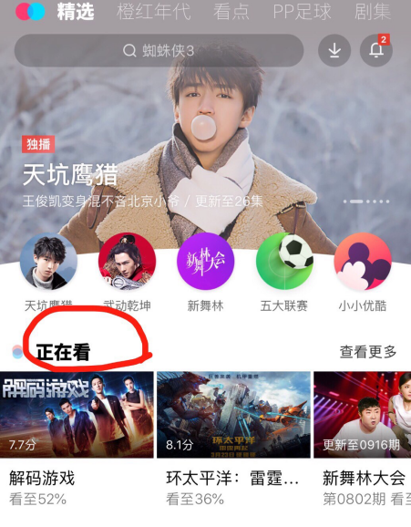 再来说一些小变化,虽然取消了大部分栏目,但是优酷那些最精彩的新剧集、综艺等也没有找不到,只不过变成了五个圆形的图标,感觉清爽直观了很多,也保证了好内容不会被漏掉。另外,首页主推荐栏下还新增了“正在看”,这个版块的出现节省了每天寻找播放记录的环节,省事多了。