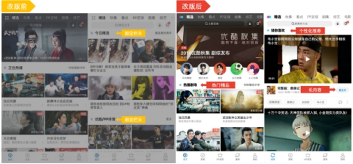 昨天,优酷首页改版了,只要更新了优酷APP版本的小伙伴就会发现,首页发生了很大的变化,用信息流推荐视频,变得更智能,更懂每一个用户的喜好了,还有人因此一刷就几个小时停不下来。那么,优酷新首页,到底和以前有什么不同?让我们来看一张图: