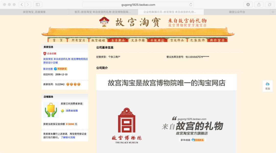 另外,故宫淘宝的微博认证是北京故宫文化服务中心,服务中心主管部门是故宫博物院。故宫淘宝的淘宝店铺经营主体是北京尚潮创意纪念品开发公司。故宫文创官方旗舰店的经营主体是北京故宫文化传播有限公司,出资人是故宫出版社。
