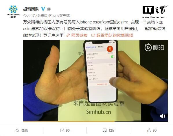 昨日,国内 " 超雪团队 " 宣布,其已经成功将国内手机号码写入 iPhone XS 的 eSIM 卡当中,实现双卡双待。今日,该团队宣布,已经成功将国内手机号码写入三款新 iPhone 的 eSIM 卡,在三大运营商尚未支持的情况下实现实体卡 +eSIM 卡双卡双待。