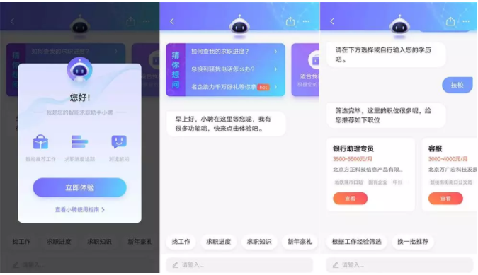 同时,58同城“智能求职助手-小聘”一定程度上解决了需求入口分散化的问题,通过多种服务在统一入口的发起,使用户更便利地解决问题。“智能求职助手-小聘”根据用户画像锁定使用场景,打造千人千面的服务体验,满足不同求职者的差异化需求。