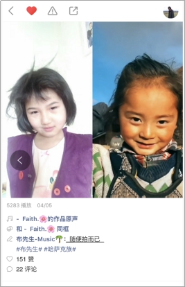 目前原发视频播放量已突破千万大关,老铁们尤其是各少数民族老铁们争相与其视频或音乐同框。截至4月8日,同框作品累计超过60万条。佤族、藏族、彝族、傈僳族、拉祜族等各民族的大小朋友都加入其中,和最美藏族小天使同框俨然变成各民族pk自然美的大趴。