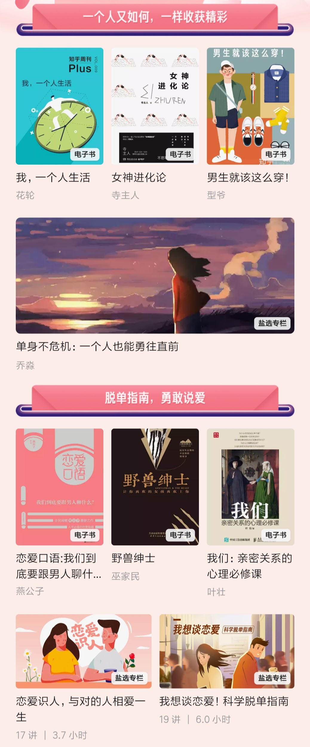 本次盐选会员日依据个人所处的情感状态分为“一个人又如何,一样收获精彩”和“脱单指南,勇敢说爱”两大推荐板块,涵盖如何一个人生活、如何开启一段情缘、如何维系与爱人之间的感情等感情生活的不同阶段。