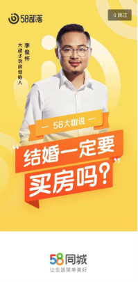 58部落还特邀房产界专家“大胡子说房”,与网友一起探讨“结婚租房还是买房”的话题。“大胡子说房”结合楼市发展趋势,给网友们提出了中肯建议:“哪怕买小,哪怕买远,哪怕回老家的省会,哪怕房子只作为投资品,请买房后再结婚。当然遇到一个真心相爱的人,比遇到一个能买得起房的人更难,如果确定了是对的人,也请不要错过,租房结婚也可以选择”。以买房为原则,以租房为例外,一切以感情为重,专家意见让网友们顿觉豁然开朗。