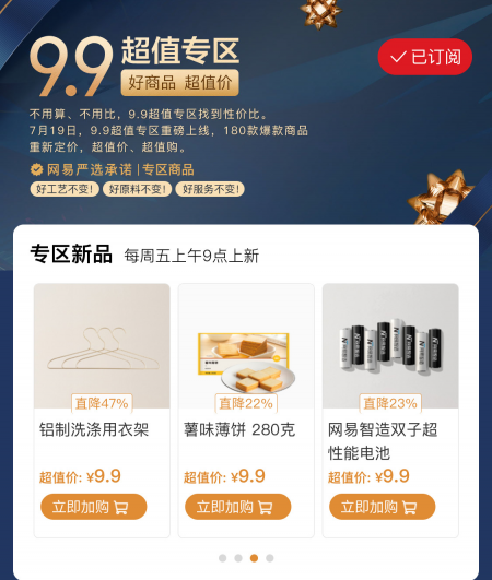不仅限于此,网易严选于7月19日上线的“9.9超值专区”,同样是D2C模式优势所在。 专区中,严选将平台中共180款“爆品”,按原价5-8折的折扣重新定价,不过,并非单纯“价低”,进入专区的每款产品均有好评率超过95%、复购率超过50%、高性价比标签超50%的“三超”标签,真正为消费者提供了质佳且不贵的购物体验。