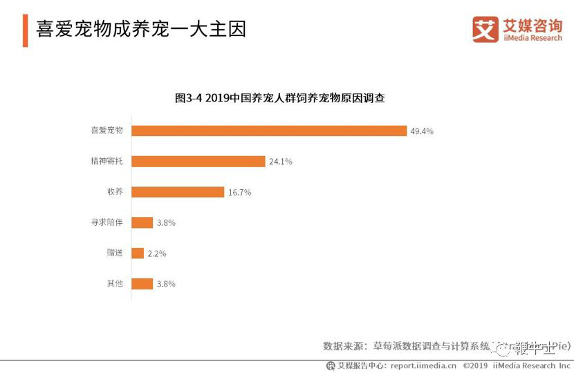 精神依托外,喜爱宠物是养宠最主要的原因。根据艾媒咨询的《2019 中国宠物经济运行状况与投资价值研究报告》指出,在中国宠物人群饲养宠物原因调查中,喜爱宠物的养宠人群最多,占 49.4%,其次为将宠物视为精神寄托,占 24.1%,而寻求陪伴的人群却只占 3.8%,所以,喜欢宠物的人一直很多,宠物市场也一直很庞大,只是之前人们的消费需求没有被充分挖掘而已,现在的宠物市场仍需要继续挖掘消费需求。