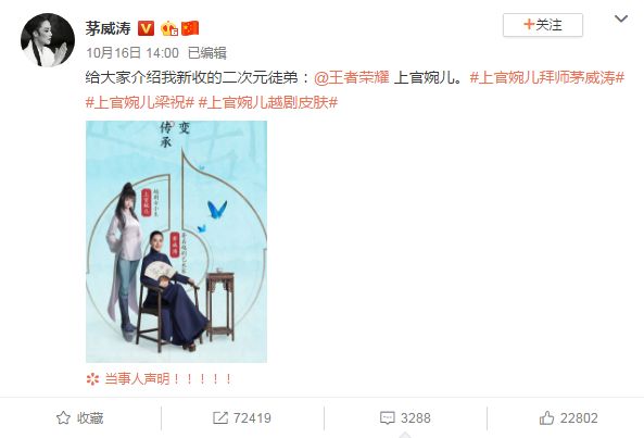 中国传统曲艺名家、浙江小百花越剧团的灵魂人物茅威涛老师发微博官宣“收徒”,获得大量玩家路人关注