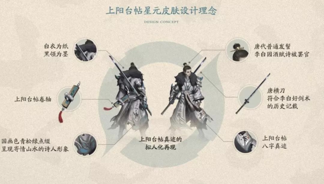 知乎的一个高赞回答里写道:李白(上阳台帖皮肤)的服装、发型、配饰都是以文人形象为基础设计的,配色主要选用了与书法作品相契合的青色和灰色,原本的酒壶配饰也替换为了《上阳台帖》卷轴,进一步还原了历史上真实的李白形象,还将飘逸洒脱的文人气质展现得淋漓尽致。