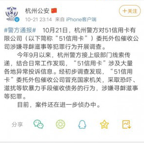最近的降维打击来自金融行业。10 月 21 日上午,一则「警方突击调查 51 信用卡杭州总部,带走多名员工」的视频在社交网络上热传,随之有多个相关爆料流传开来。当天晚间,杭州警方发布情况通报,同时 51 信用卡官方及 CEO 孙海涛也相继发布情况说明,这起事件很快引发坊间业界的关注热议。
