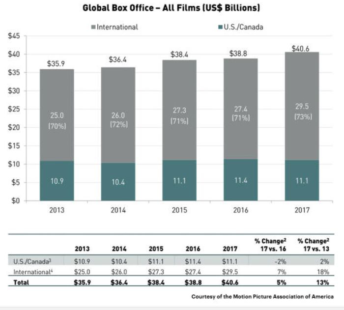 美国电影协会发布的数据显示:随着在线视频流媒体服务的渗透率越来越高,2018 年全球观众在线观看娱乐节目的支出首次超过了电影院消费,而 2017 年北美地区观影人数更是达到了近 23 年以来的最低值。