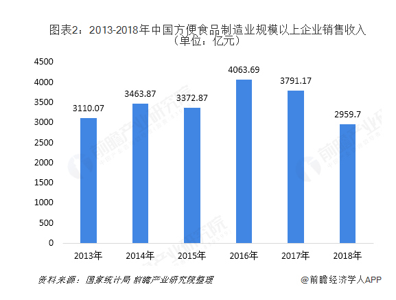 根据国家统计局数据显示,2016 年我国方便食品制造行业规模达到有史以来的峰值 4063.69 亿元,此后的 2017 年、2018 年连年下跌,截止 2018 年底行业规模下降至 2959.7 亿元,跌幅超过 25%。