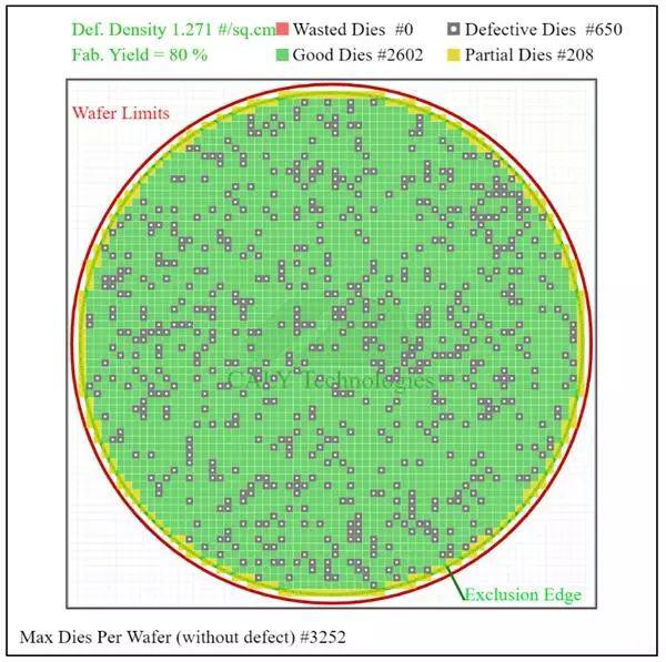 按照这个面积计算,一块 300mm 晶圆应该能生产出 3252 颗芯片,良品率 80%,那么完好的芯片至少是 2602 个,缺陷率 1.271 个每平方厘米。