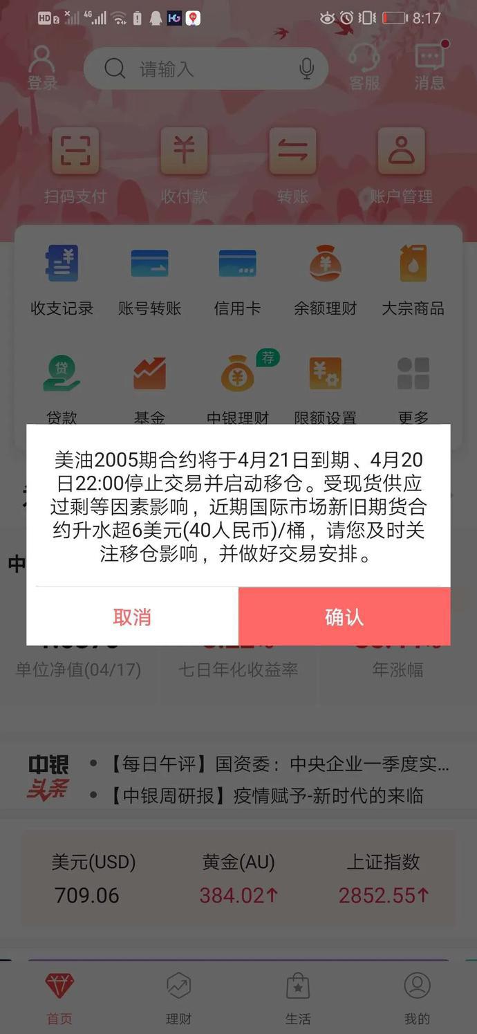 4 月 22 日,多位投资人称,已经收到中国银行发来的短信提示,要求客户根据平仓损益及时补足交割款。