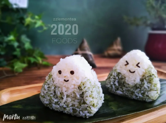 zz柠檬t(美图ID:37449075)则用糯米制作的粽子形状寿司,加入海苔粉放入磨具导出,最后用寿司剪出表情,方便又可爱。