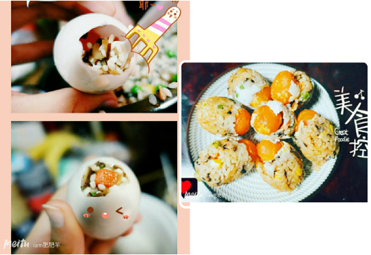 除了传统的粽子制作,不少人在美图秀秀社区也分享了糯米有关的创意美食,iam肥肥羊(美图ID:1045539508)就分享了美味又好看的七彩糯米蛋做法。准备食材后将生咸鸭蛋洗净,用剪刀在头顶戳个洞,将蛋白倒掉,留下蛋黄,之后将胡萝卜、香菇、虾仁切丁,倒入泡好糯米,加入生抽老抽搅拌,再将调好的配料塞入鸭蛋中,最后隔水蒸45分钟,蛋壳剥去,就能用勺子挖着吃了!