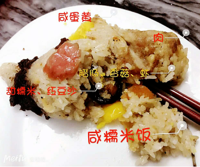 不少网友也热衷分享各地新奇的粽子,比如美图秀秀用户安晚晚(美图ID1626123876)的汕头“双烹粽”,一半是咸的一半是甜的,每家馅料各有不同,但都大同小异,主要馅料包括香菇、腊肠、鹌鹑蛋或咸蛋黄、五花肉、肉末、虾、甜糯米、咸糯米、红豆沙等。可作为早餐配搭豆浆,也可以作为夜宵配甜汤。
