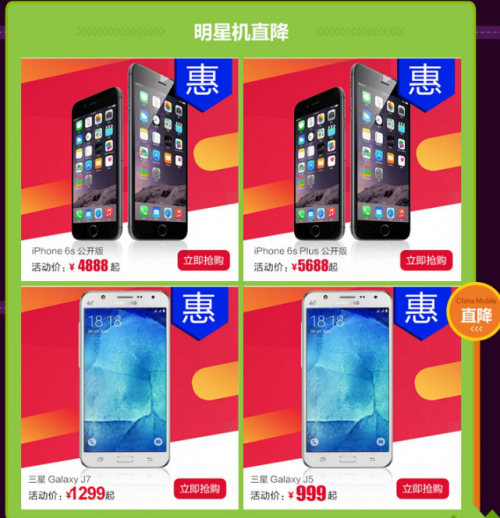 “4G 2周年”移动终端活动主要是裸机优惠,iPhone6s 16G玫瑰金裸机直降300,4988。而三星 Galaxy J7 则由原价1798,直降499变为1299。此外还有一些中端热机,但总体优惠机型不多。