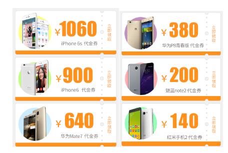 活动期间,还有iPhone 6、华为Mate7、华为P8、魅蓝note2、红米2等多款热销终端的专属代金券领取,使用优惠券后相当于享受原价8折优惠。