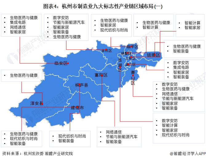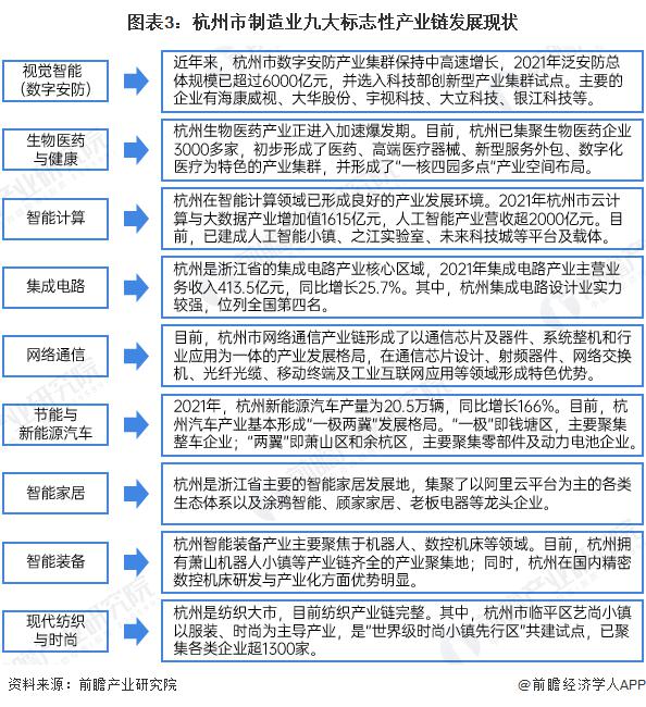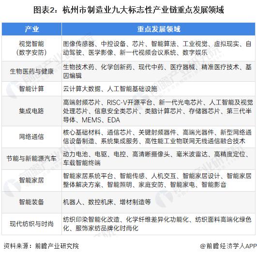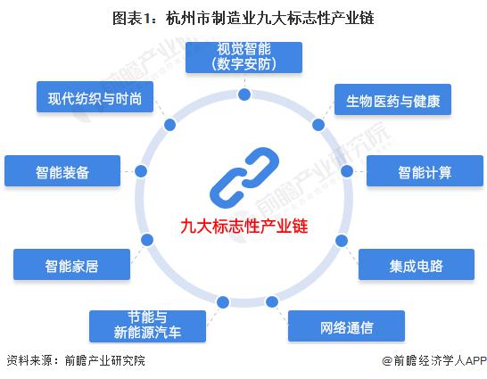 近年来,杭州在做强数字经济的同时,也在重点推进制造业发展。" 十三五 " 时期,杭州提出重点打造 "1+6" 产业集群 ;2019 年,杭州提出 " 新制造业计划 ",首次将数字经济和制造业列为高质量发展 " 双引擎 "。进入 " 十四五 ",杭州制造业九大标志性产业链的新布局在多个重要规划文件中出现。2021 年,制造业九大标志性产业链正式写入 " 十四五 " 规划,具体包括视觉智能 ( 数字安防 ) 、生物医药与健康、智能计算、集成电路、网络通信、节能与新能源汽车、智能家居、智能装备、现代纺织与时尚。