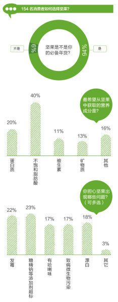 《消费者报道》对152名消费者进行的问卷调查显示,有超过三分之一的消费者想从坚果中获取不饱和脂肪酸。