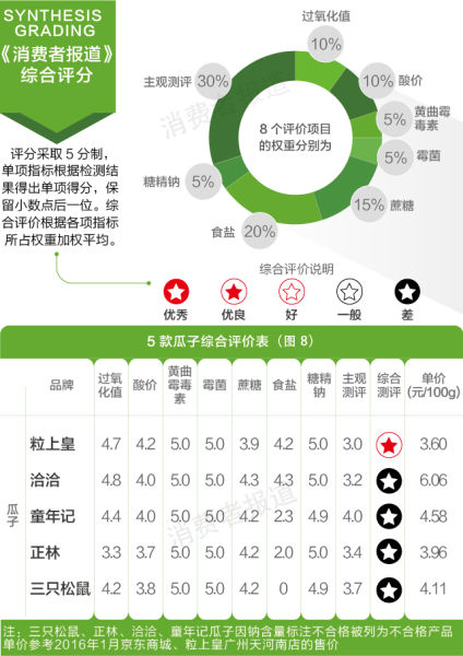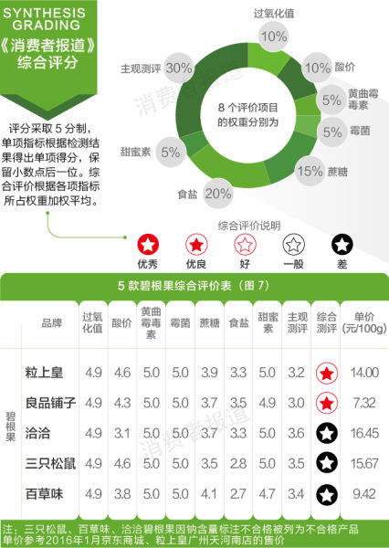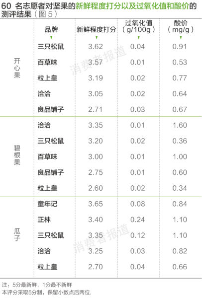2016年1月,《消费者报道》向第三方权威检测机构送检了三只松鼠、良品铺子、百草味、洽洽和粒上皇等5品牌的开心果和碧根果,以及正林、童年记、洽洽、三只松鼠和粒上皇等5品牌的瓜子(葵花籽),检测其安全性、新鲜度,并召集60名志愿者进行口味和新鲜度的主观测评。