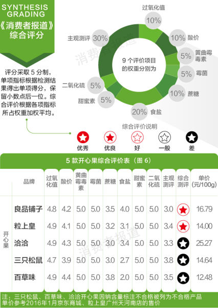 2016年1月,《消费者报道》选择了目前市场上知名度较高的5品牌开心果和碧根果,以及5个品牌的瓜子(葵花仔),在第三方权威检测机构实验室进行了对比检测。检测指标包括过氧化值、酸价、黄曲霉毒素、糖精钠和甜蜜素等安全性指标,以及糖、食盐等营养指标。