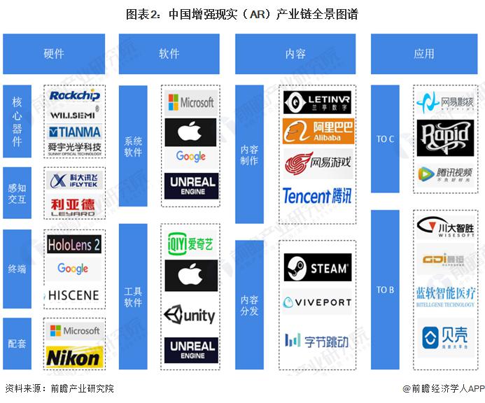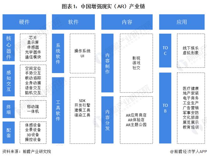 增强现实(AR)产业链上游为软硬件制造,中游为内容制作与分发