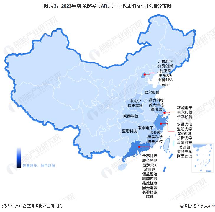 从中国增强现实(AR)产业链区域分布来看,AR 相关企业主要分布在我国东部地区。其中,广东、浙江、北京的增强现实(AR)产业链较为完整,涵盖光学模组制造、电子元器件制造、内容制作与分发等环节。