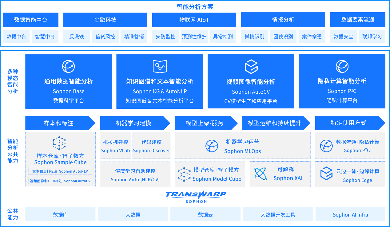 * 场景“易”开发:提供Vlab、Discover、AutoCV多个模块,通过可视化、编程式、流程式的建模服务,以及内置的开源建模框架、自研的Sophon ZenGraph图计算框架、Sophon TS 时间序列计算库及基础机器学习算法库,让建模场景易搭建;
