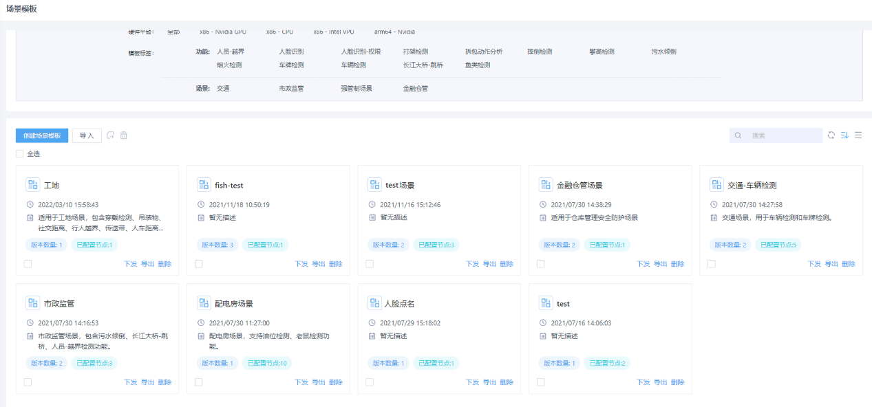 场景模板内置基于模型和业务的积累,平台预置了面向不同行业领域的应用模板,开箱即用。同时场景模板开放了业务规则的配置能力,实施人员可基于模板在大规模部署落地时,仅修改配置即可。此外,平台提供拉拽的交互方式辅助用户将模型和业务逻辑串联,形成标准场景模板,业务流程支持不同模态的业务流组合分析,场景包可以在平台进行积累,版本管理和迁移。