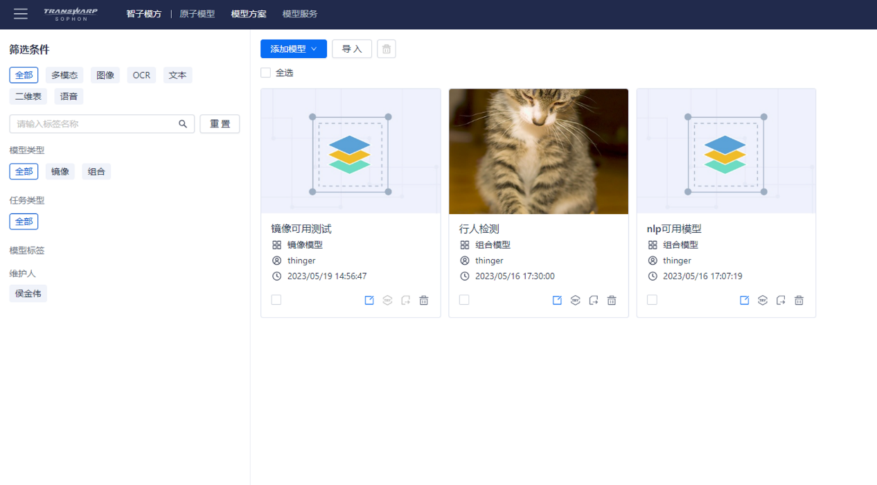 * 模型仓库:新版本Sophon提供的模型仓库功能模块,作为模型开发与模型应用的中间环节,统一纳管多源模型,让模型管理和应用人员能快速找到最适合业务场景的模型,实现组装与评估输出高质量模型服务。