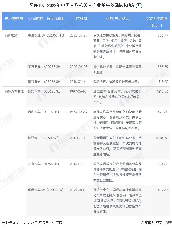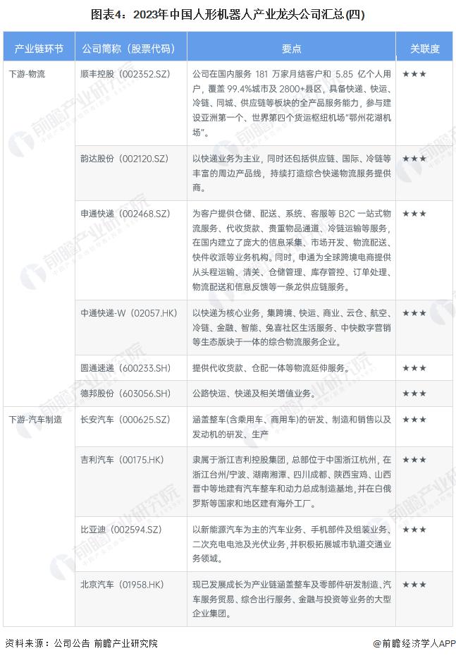 人形机器人下游应用领域广泛,所涵盖的公司极多,通过分析中游公司的客户情况,前瞻认为医疗康复、物流、汽车制造是人形机器人的主要应用领域。其中,医疗康复领域公司包括普门科技 ( 688389.SH ) 、诚益通 ( 300430.SZ ) 、翔宇医疗 ( 688626.SH ) 、伟思医疗 ( 688580.SH ) 、麦澜德 ( 688273.SH ) ; 物流领域公司包括顺丰控股 ( 002352.SZ ) 、韵达股份 ( 002120.SZ ) 、申通快递 ( 002468.SZ ) 、中通快递 -W ( 02057.HK ) 、圆通速递 ( 600233.SH ) 、德邦股份 ( 603056.SH ) ; 汽车制造领域公司包括长安汽车 ( 000625.SZ ) 、吉利汽车 ( 00175.HK ) 、比亚迪 ( 002594.SZ ) 、北京汽车 ( 01958.HK ) 、理想汽车 -W ( 02015.HK ) 、广汽集团 ( 601238.SH ) 、长城汽车 ( 02333.HK ) 、蔚来 -SW ( 09866.HK ) 、上汽集团 ( 600104.SH ) 、长城汽车 ( 02333.HK ) 。