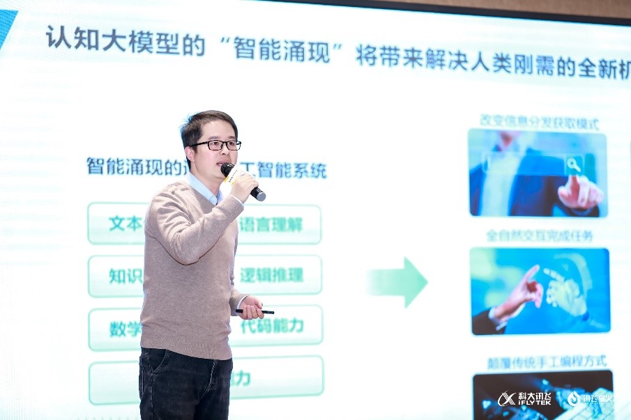 科大讯飞AI服务市场运营总监王东昊向大家介绍讯飞星火认知大模型的最新发展情况,他表示自今年5月6日星火认知大模型正式发布以来,经过多轮更新,星火目前已经实现在教育、办公、汽车、金融、工业及医疗等多个使用场景的功能落地,科大讯飞正致力于让星火认知大模型走进千家万户、赋能千行百业,助推产业升级。