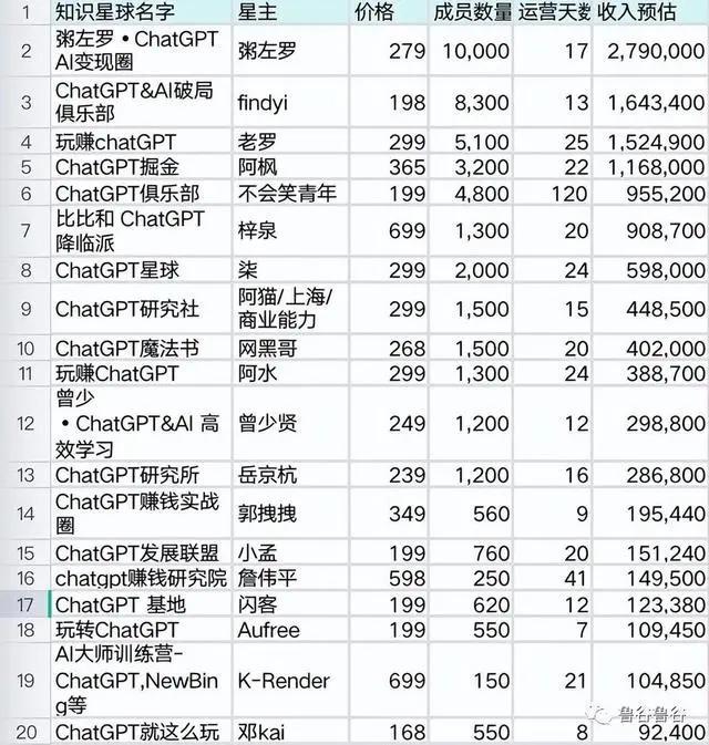 此前根据「红星资本局」的调查,在这张图中,知识星球中排名前 4 的培训课,除去平台扣除的手续费,按最低 100 万元来算,企业主拿到的也是一笔不小的收入," 做培训课的已经赚了几百万 " 的说法也不夸张。「硅基研究室」了解到,除了知识星球外,还有小报童等平台,目前也成了 AI 搞钱人奔赴的社区。