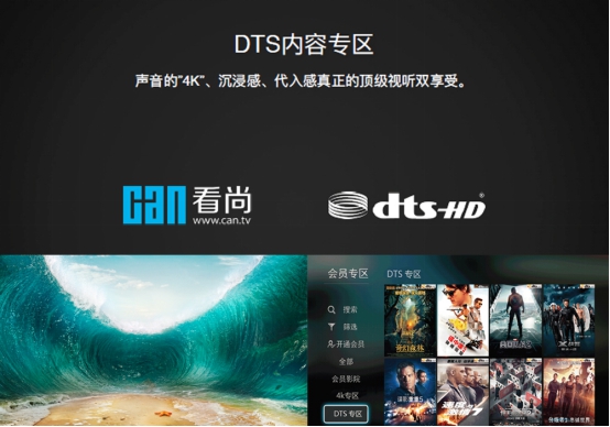 9月1日,在看尚的“科技与艺术之旅”品牌季启幕盛典上,看尚宣布推出国内首家电视端DTS专区,以超清视频内容搭载DTS-HD环绕声音频,为用户打造真正的沉浸式家庭影院,用声音的“4K”、沉浸感、代入感,给用户带来真正的顶级视听双享受。在产品与内容的结合下,看尚不仅成为了智能电视行业里首个推出视听体验硬件产品的品牌,也成为了业界首个布局软硬件体验平台的智能电视品牌。