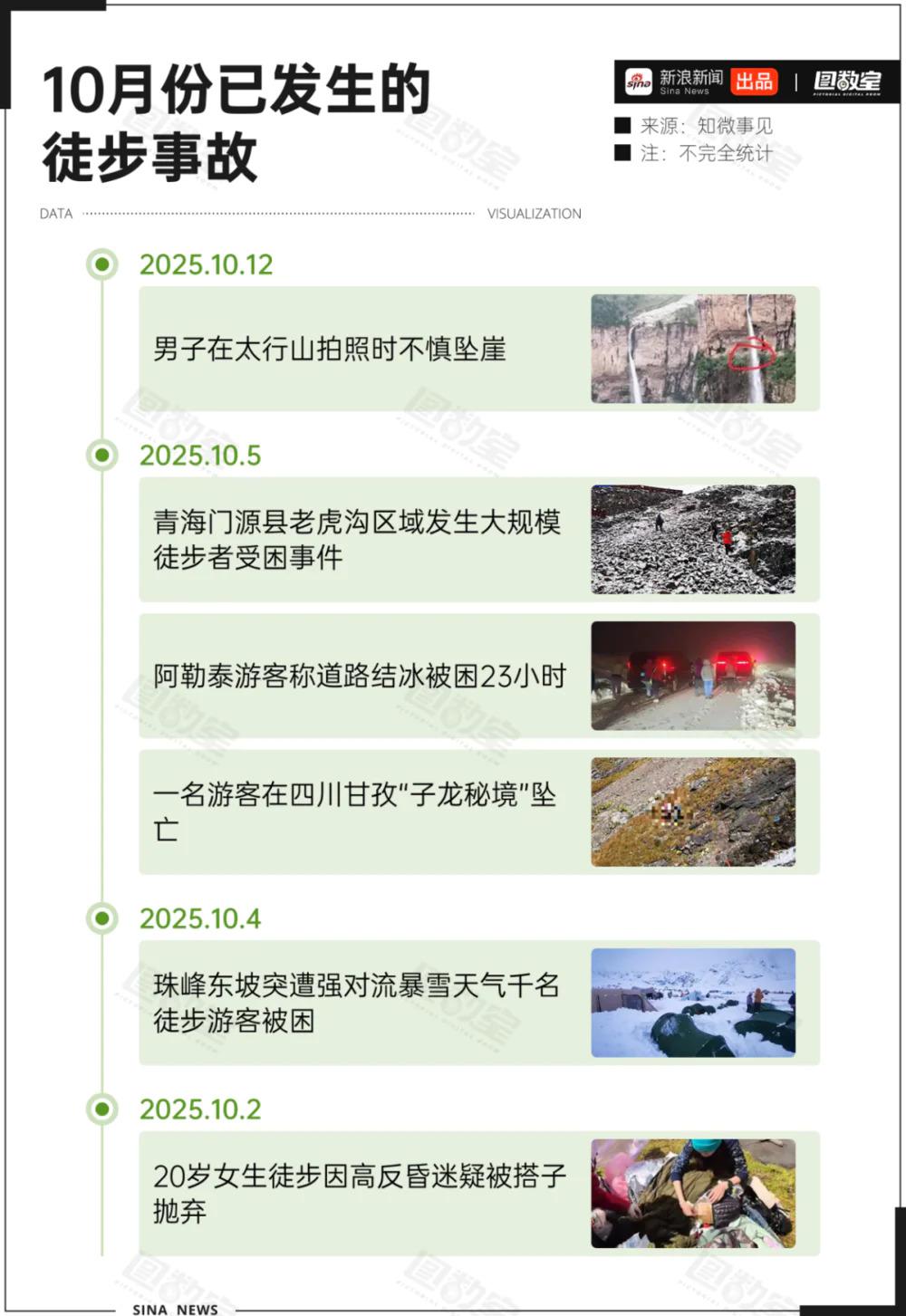 10 月 13 日,一男驴友在位于河南新乡辉县的南太行老龙口瀑布下方拍照时不慎坠崖,后经确认已身亡。这并不是近期唯一的徒步事故,10 月刚刚过半,发生的徒步事故已经达到 6 起。