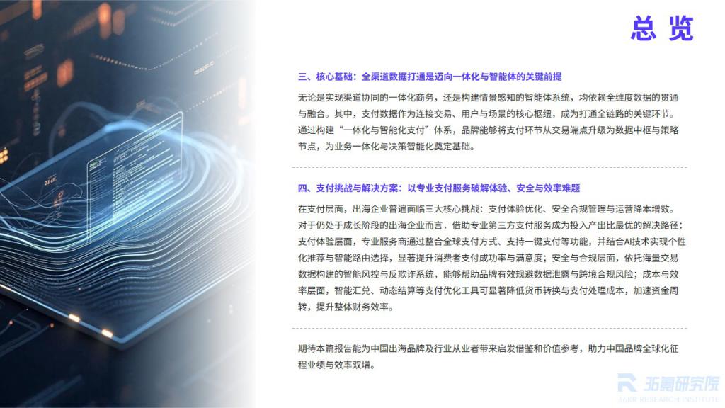 生成式 AI 的迅猛发展正推动 " 智能体商务 " 迅速普及。这一新兴模式通过 AI 智能体重塑消费流程、拓展销售场景,并显著提升运营效率。值得强调的是,智能体商务并非孤立存在,而是与一体化商务深度耦合:在 AI 赋能下,品牌能够实现超高效、高度个性化的无缝体验,形成 " 一体化 × 智能化 " 的倍增效应,开辟全新增长空间。然而,目前出海企业对 AI 智能体的应用仍处于探索阶段,其在营销推荐、供应链优化、支付风控等环节的潜力尚未充分释放,未来增长前景广阔。