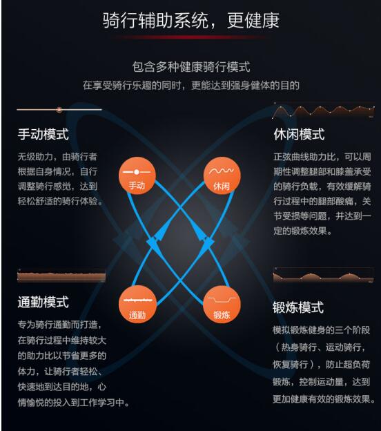 骑行辅助系统,包含多种健康骑行模式,在享受骑行乐趣的同时,更能达到强身健体的目的。
