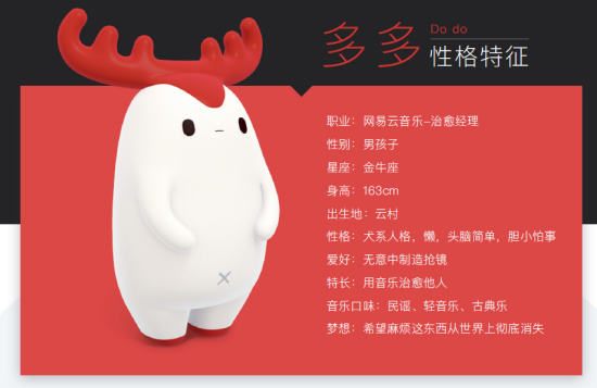 据了解,经过多次用户调研与方案研究,网易云音乐吉祥物多多和西西读音来源于音阶“do”和“xi”,形象则以“鹿”为原型。鹿本身拥有文雅、平和的性格特性,象征着年轻、活力、独特,在很多文艺作品中,鹿也代表了新生与希望,透露出快乐与灵性。此外,鹿的性格也具有一定的普世性,能包容不同的价值与体系,更符合网易云音乐这样拥有不同风格的音乐平台特性。