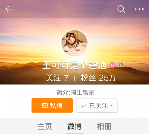 前几天,一只狗火了,怎么火的呢?一只狗开通了它的微博,在223天里面只发了44条微博就获得了25万粉丝。这只狗的账号是“王可可是个碧池”。