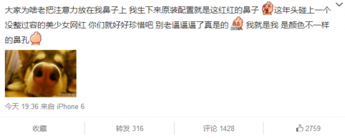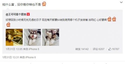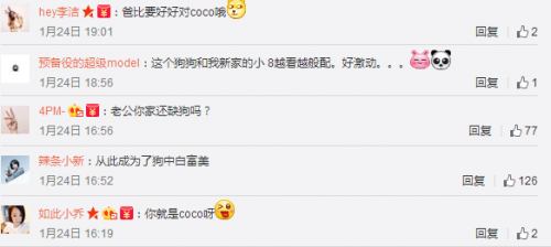 然后发现很多人都是在1月份返回去评论一只狗在大半年以前发的微博,这是多么无聊的一件事啊,很多粉丝也自嘲说他竟然无聊的把一条狗的微博全部看完了。所以我就去分析了下微博下面的评论,之所以第一条微博能带来这样的效应,最合理的解释就是我们国民老公王思聪的太太团前去留名了。“你现实生活我无法参与,但你网上生活我一定要留下足迹”,这就是我对新媒体时代“观光团”的定义。