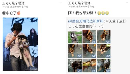 接下来上面是2014年7月28日,这个微博放了一张韩寒抱着《后悔无期》中那只阿拉斯加,并调侃道:看上了它。(八卦一下:王总的狗是母的,韩寒电影的狗是公的,跟王总比起来他狗的性取向还是正常的!)9月18日它又@后会无期马达加斯加进行了互动。