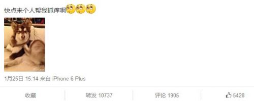 这条微博是1月31日之前转发量唯一达到10000+的。我分析了“碧池”发的每一条微博,这条微博之所以转发量大是因为这条微博发出了一种请求,对,请求!让粉丝有那么一种虚拟的参与感在里面。好吧,咱们换一个情景来想这个问题,如果上面的这张照片换成王思聪的照片,再附上这句:快点来个人帮我抓痒。估计这转发、评论、点赞量都得高出好几倍吧。估计那时粉丝不仅仅只是想帮思聪抓痒吧,可能还有跪舔吧。所以如果运营一个粉丝量够多的微博,要多跟粉丝互动,多让粉丝意淫,让他们产生参与感,这是增加微博活跃度的良策。
