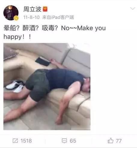 早在2012年,周立波就曾直白的讽刺吸毒制毒,那时的周立波显得还是那样“正直”。2015年,前妻张洁再次发布文章,声讨周立波,重提周立波吸毒。几个月后,周立波又在微博上发了一张自己趴倒在沙发上的照片,配文“晕船?醉酒?吸毒?No~~Make you happy!!”
