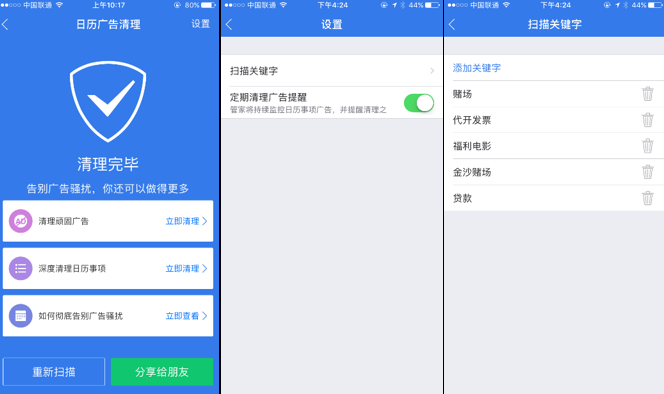 (图:腾讯手机管家自定义关键词清理日历广告)